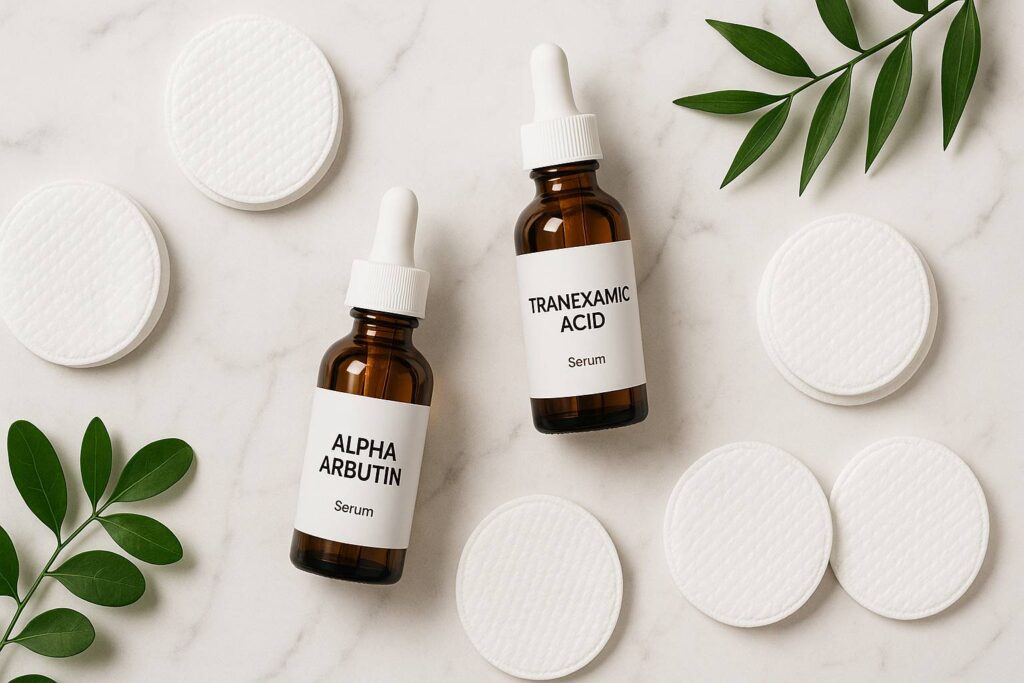 Pendekatan Alpha Arbutin lebih langsung dan luas, cocok untuk noda akibat sinar matahari (PIH) dan pasca-inflamasi. Tranexamic Acid lebih spesifik menargetkan jalur plasmin yang terlibat dalam peradangan kronis, sehingga lebih jitu untuk melasma dan kemerahan yang menyertai pigmentasi.
