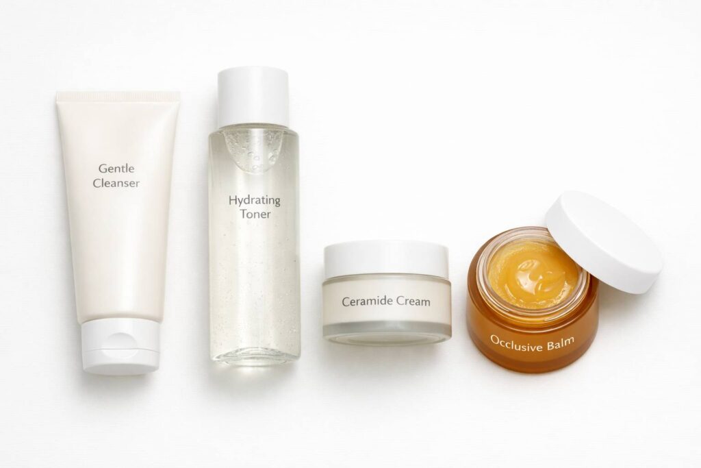 1. Hari 1: Stop semua aktif (AHA, BHA, retinoid, vitamin C). Cuci wajah sekali sehari dengan gentle cleanser, lalu aplikasikan occlusive (petroleum jelly) di area yang paling iritasi.